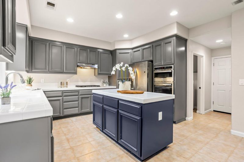 - 220 Volt Outlet, Cooktop - Gas, Countertop - Tile, Dishwasher, Garbage Disposal, Hood Over Range, Island, Microwave, Oven - Built-In, Refrigerator
