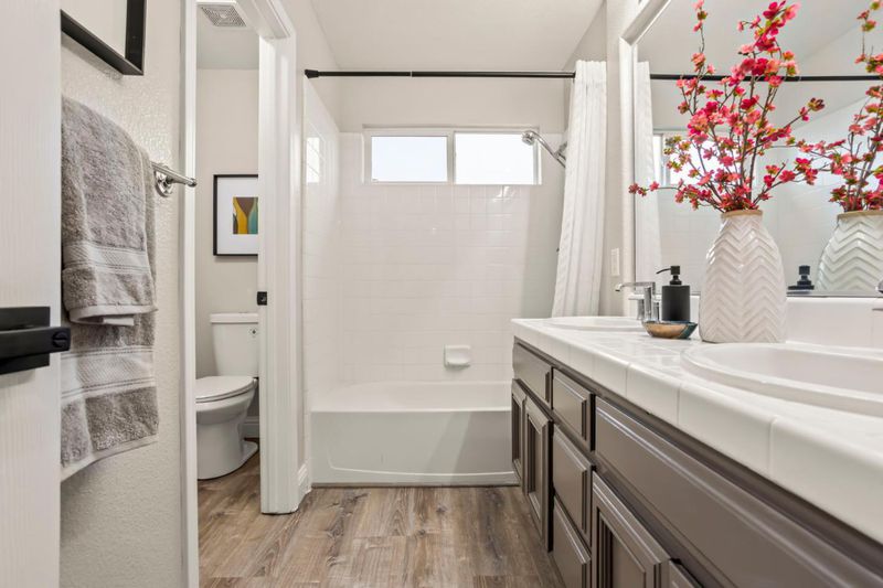 - Double Sinks, Half on Ground Floor, Primary - Tub with Jets, Shower over Tub - 1, Stall Shower, Tile