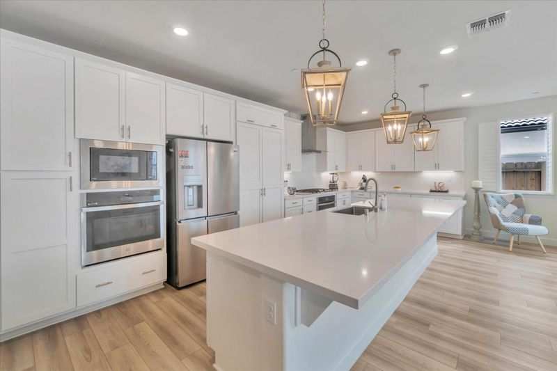 - Countertop - Quartz, Dishwasher, Garbage Disposal, Hood Over Range, Hookups - Ice Maker, Island with Sink, Microwave, Oven - Double, Oven - Self Cleaning, Oven Range - Built-In, Oven Range - Electric, Pantry