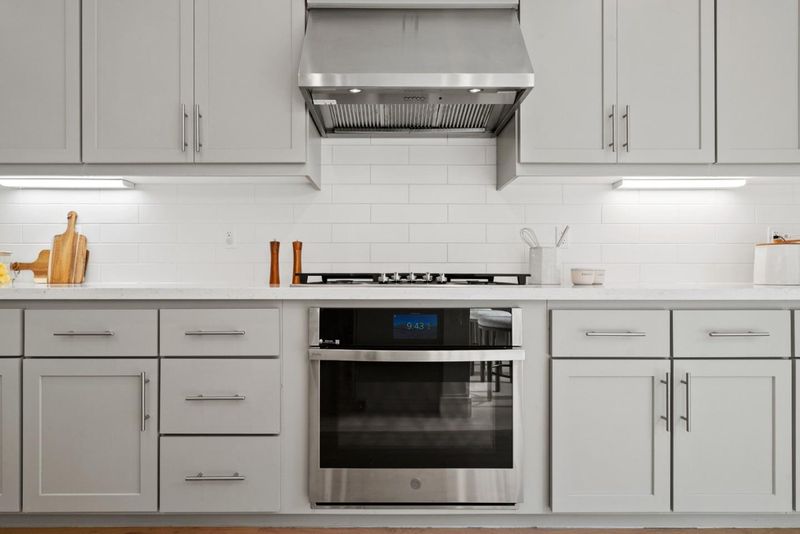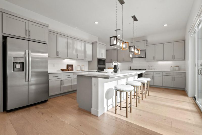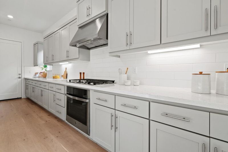 - Cooktop - Gas, Countertop - Quartz, Dishwasher, Exhaust Fan, Garbage Disposal, Hood Over Range, Hookups - Gas, Island with Sink, Microwave, Oven - Electric, Oven - Gas, Pantry, Refrigerator