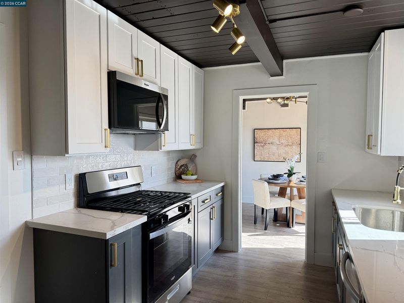 - Dishwasher, Electric Range, Microwave, 220 Volt Outlet, Counter - Solid Surface, Electric Range/Cooktop, Disposal, Updated Kitchen