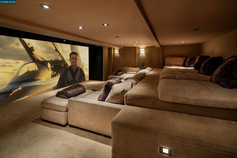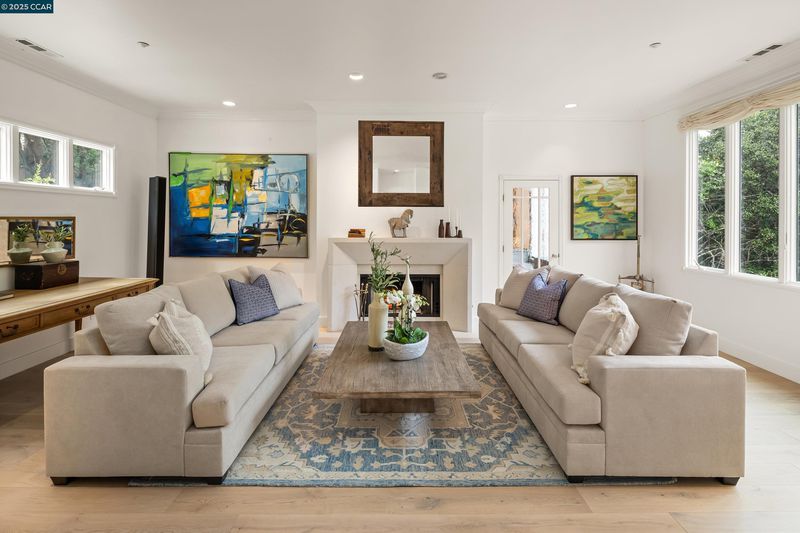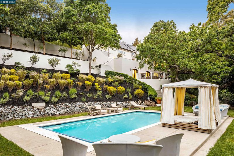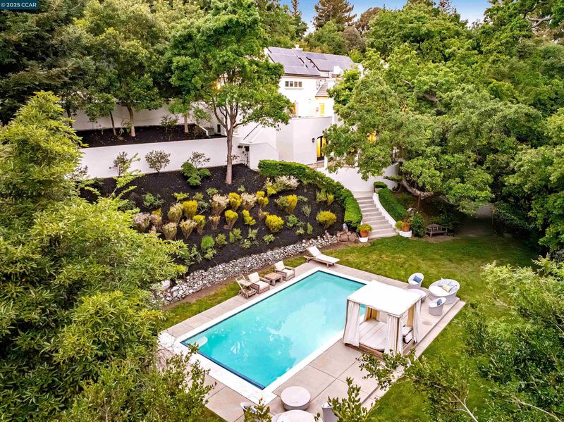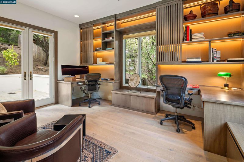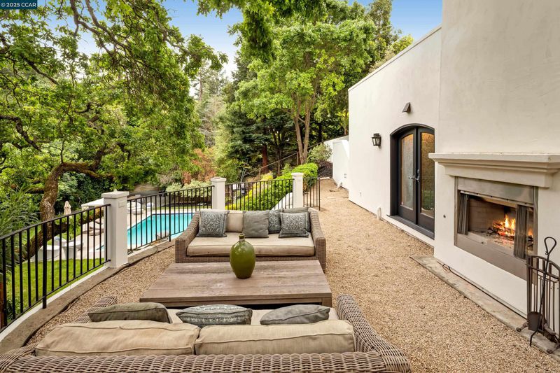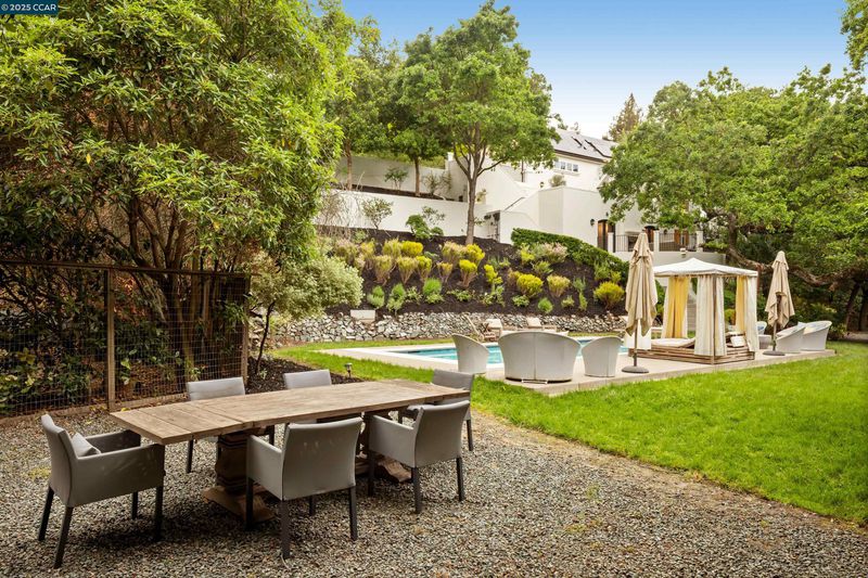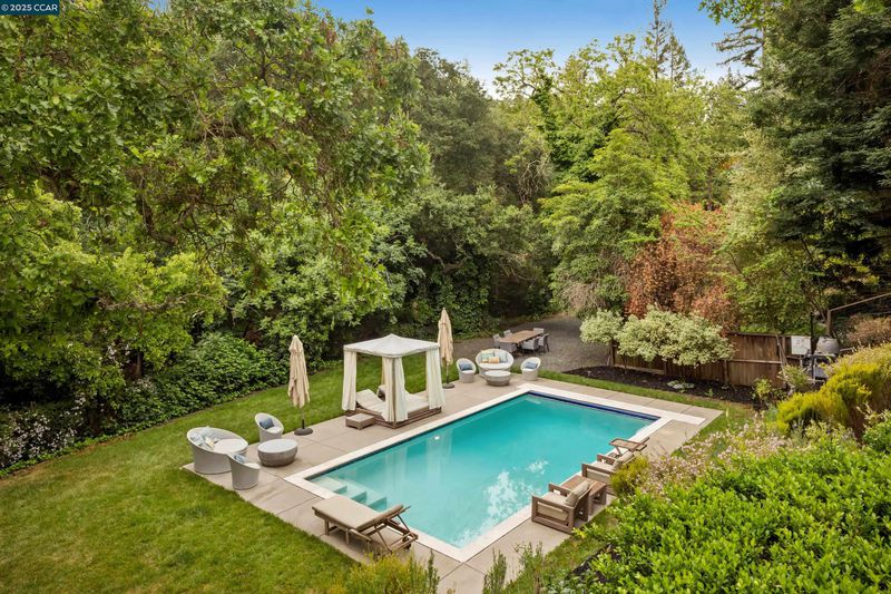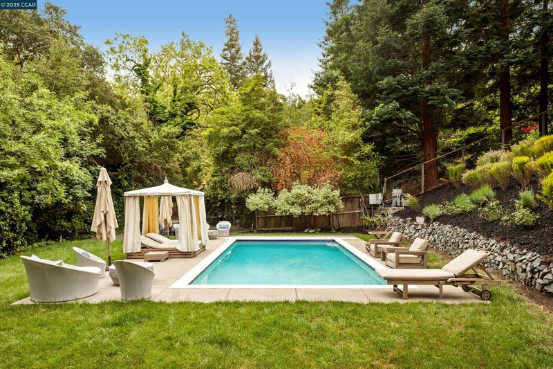 This Reliez Valley home is a private sanctuary. The main level offers formal spaces to the left and casual spaces to the right, linked by French oak hardwoods. The 384-sq-ft living room has a limestone fireplace. The dining room alongside welcomes 10-12 guests under elevated ceilings. The spacious family room also has a soaring ceiling. Nearby, a breakfast nook provides garden and pool views. Between sits the kitchen, with elite appliances, countertops, an island and bar seating. For entertainment, the home offers an 85” TV and sound system, and a spectacular 400-sq-ft cinema. A large office on the main level makes work from home easy. The 5 bedrooms are on the lower level, ensuring privacy. The principal suite is a serene haven with a custom fireplace, garden views, deck access, walk-in closet, and a spa-like bath. A second principal suite has its own en-suite bath, closet with built-in desk, and deck access. An au pair suite (now configured as a gym), with a separate entrance, completes the floor. The outdoor dining terrace seats 12-14 by a fireplace. Just steps below lie the lush lawn and heated pool and sun deck. A slate roof offers enhanced fire resistance. Although just 2 miles from Springhill Elementary and Acalanes High, the home feels a world apart, surrounded by nature.