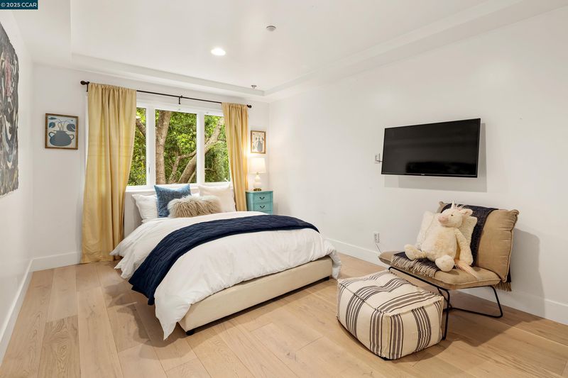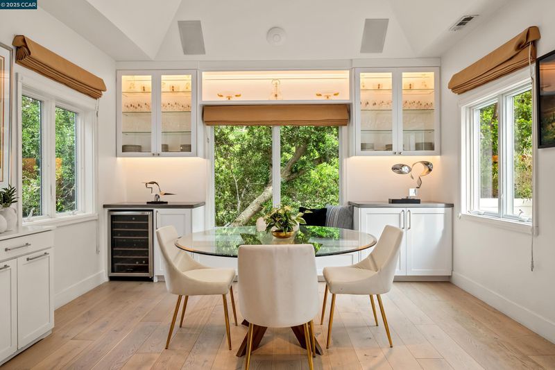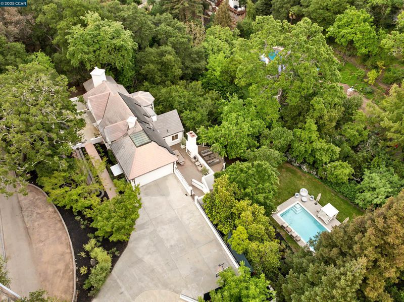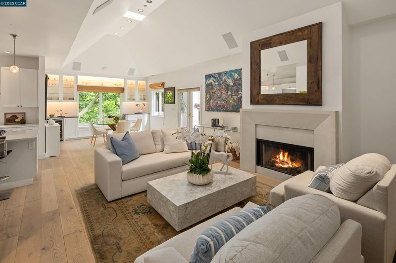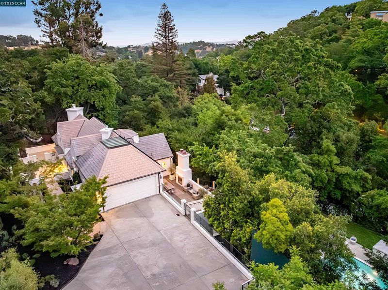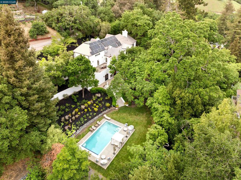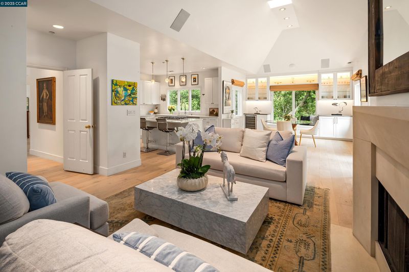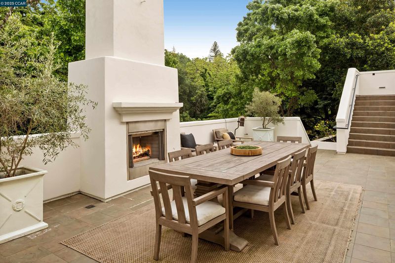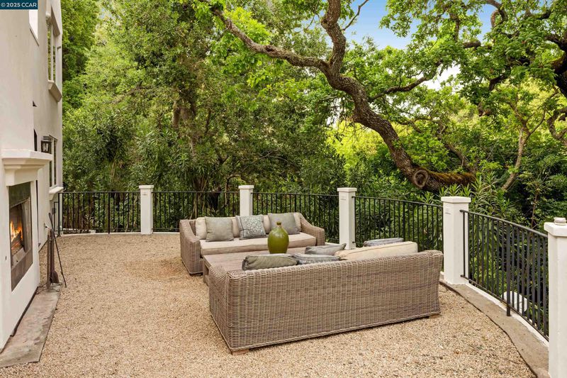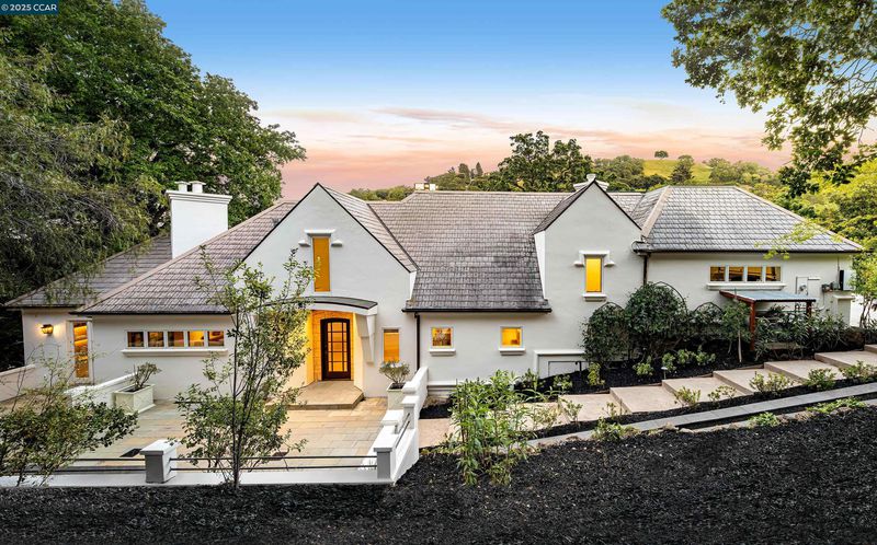 This Reliez Valley home is a private sanctuary. The main level offers formal spaces to the left and casual spaces to the right, linked by French oak hardwoods. The 384-sq-ft living room has a limestone fireplace. The dining room alongside welcomes 10-12 guests under elevated ceilings. The spacious family room also has a soaring ceiling. Nearby, a breakfast nook provides garden and pool views. Between sits the kitchen, with elite appliances, countertops, an island and bar seating. For entertainment, the home offers an 85” TV and sound system, and a spectacular 400-sq-ft cinema. A large office on the main level makes work from home easy. The 5 bedrooms are on the lower level, ensuring privacy. The principal suite is a serene haven with a custom fireplace, garden views, deck access, walk-in closet, and a spa-like bath. A second principal suite has its own en-suite bath, closet with built-in desk, and deck access. An au pair suite (now configured as a gym), with a separate entrance, completes the floor. The outdoor dining terrace seats 12-14 by a fireplace. Just steps below lie the lush lawn and heated pool and sun deck. A slate roof offers enhanced fire resistance. Although just 2 miles from Springhill Elementary and Acalanes High, the home feels a world apart, surrounded by nature.