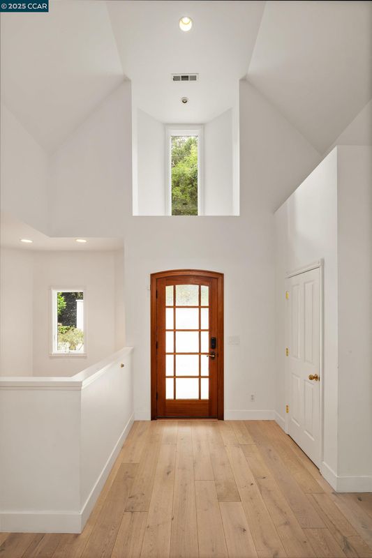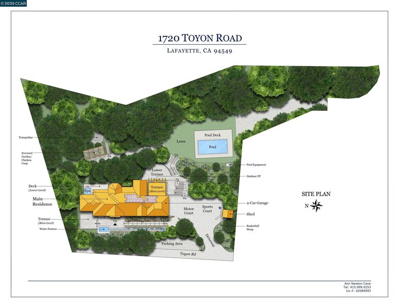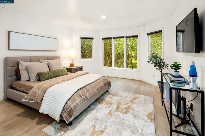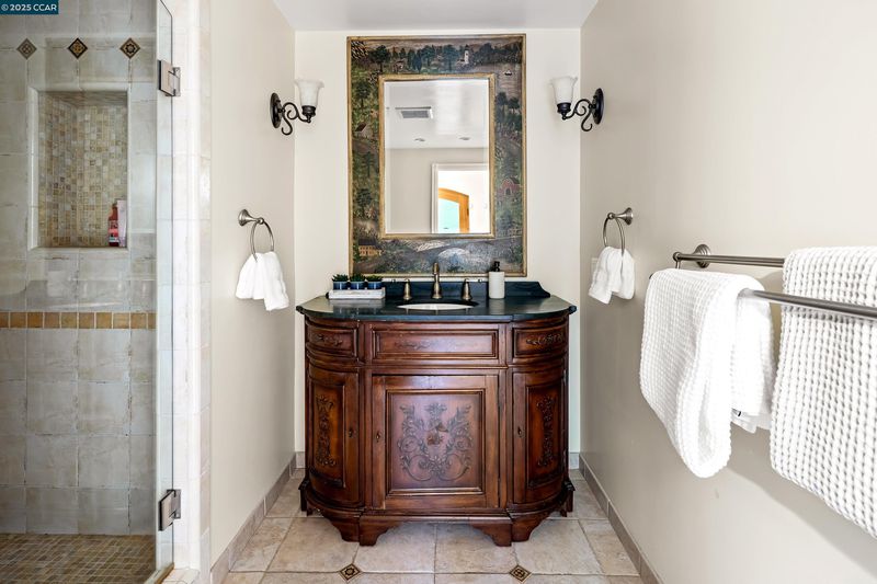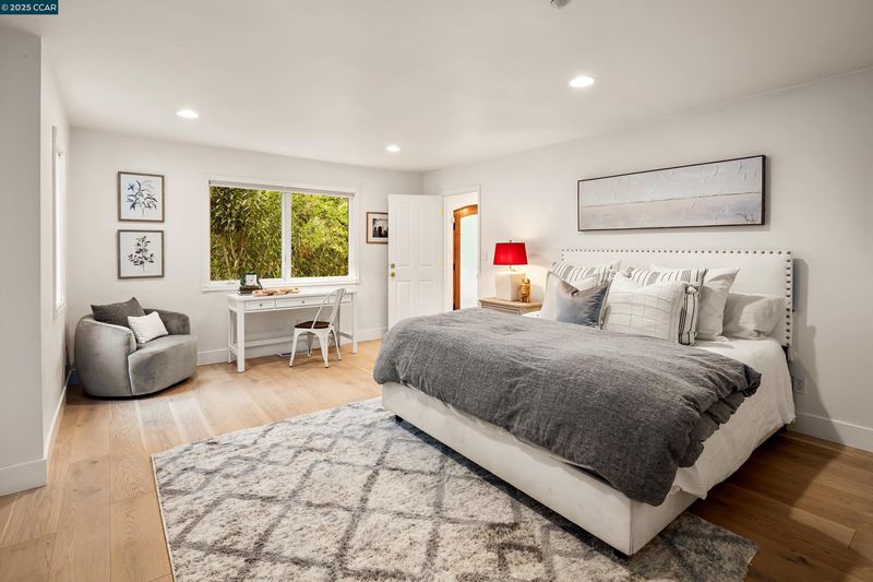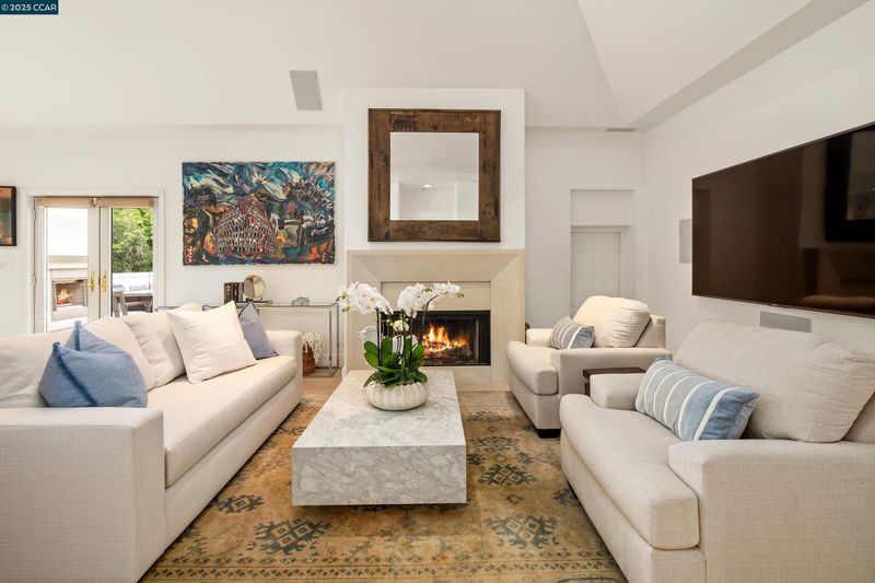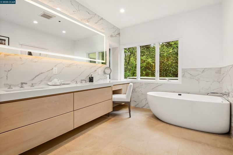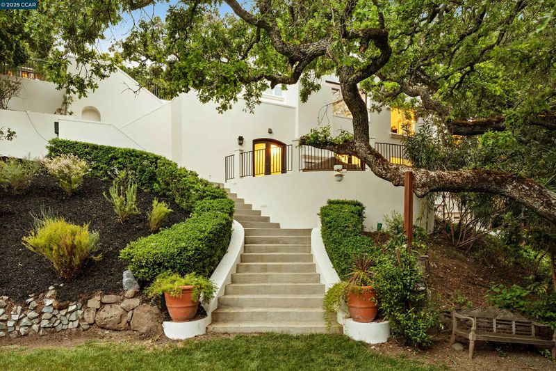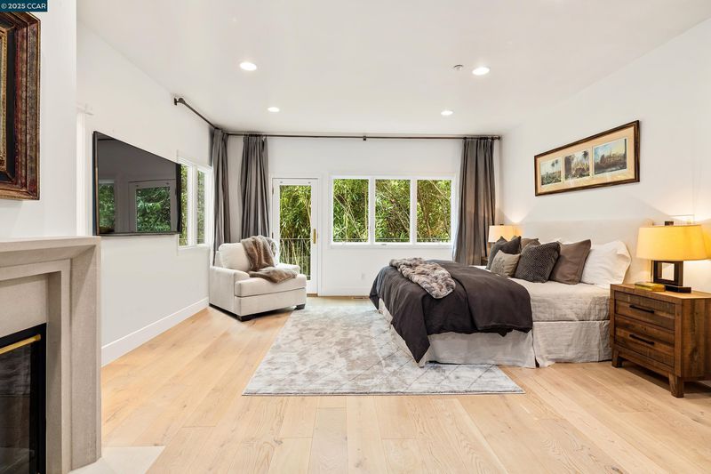 This Reliez Valley home is a private sanctuary. The main level offers formal spaces to the left and casual spaces to the right, linked by French oak hardwoods. The 384-sq-ft living room has a limestone fireplace. The dining room alongside welcomes 10-12 guests under elevated ceilings. The spacious family room also has a soaring ceiling. Nearby, a breakfast nook provides garden and pool views. Between sits the kitchen, with elite appliances, countertops, an island and bar seating. For entertainment, the home offers an 85” TV and sound system, and a spectacular 400-sq-ft cinema. A large office on the main level makes work from home easy. The 5 bedrooms are on the lower level, ensuring privacy. The principal suite is a serene haven with a custom fireplace, garden views, deck access, walk-in closet, and a spa-like bath. A second principal suite has its own en-suite bath, closet with built-in desk, and deck access. An au pair suite (now configured as a gym), with a separate entrance, completes the floor. The outdoor dining terrace seats 12-14 by a fireplace. Just steps below lie the lush lawn and heated pool and sun deck. A slate roof offers enhanced fire resistance. Although just 2 miles from Springhill Elementary and Acalanes High, the home feels a world apart, surrounded by nature.