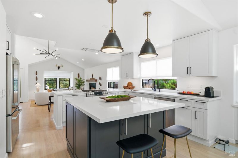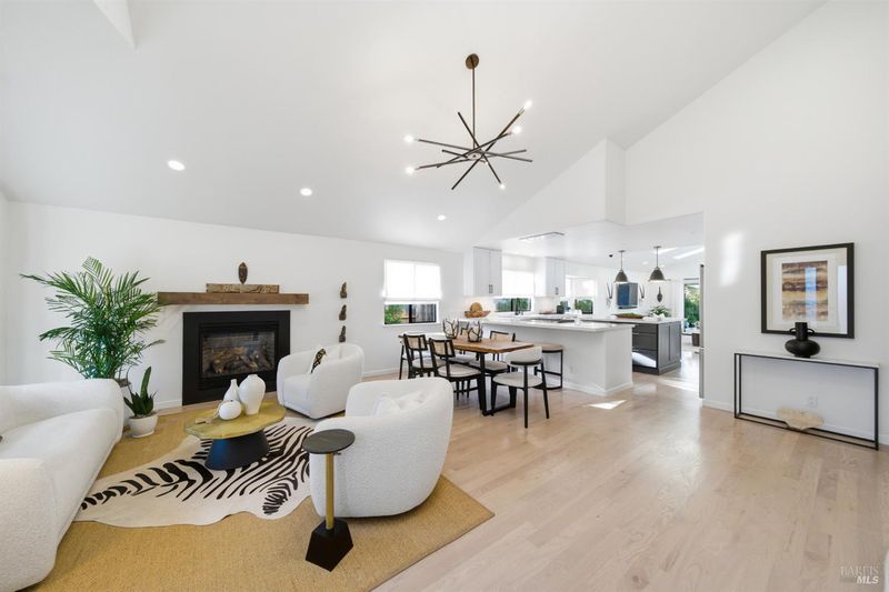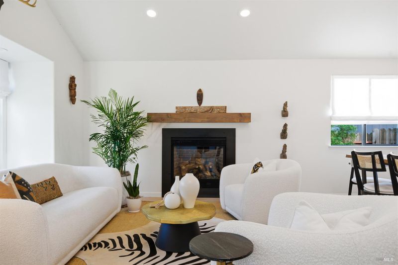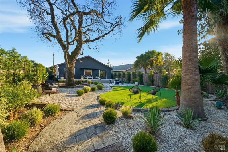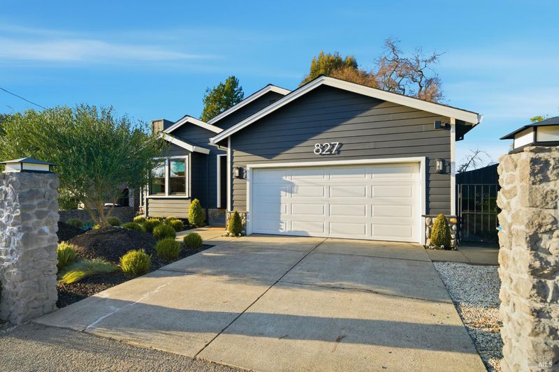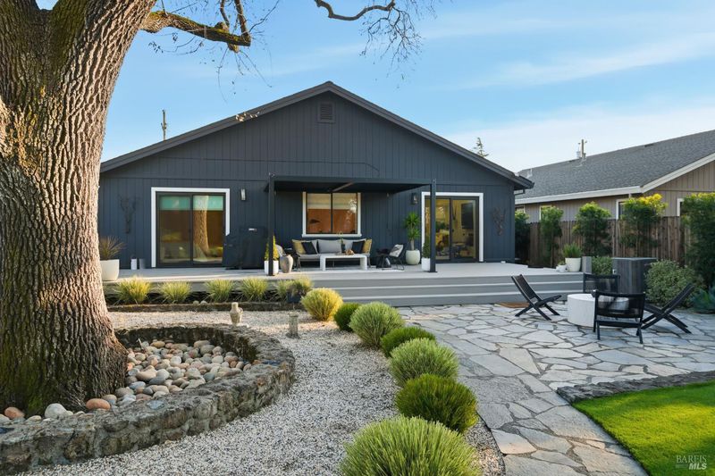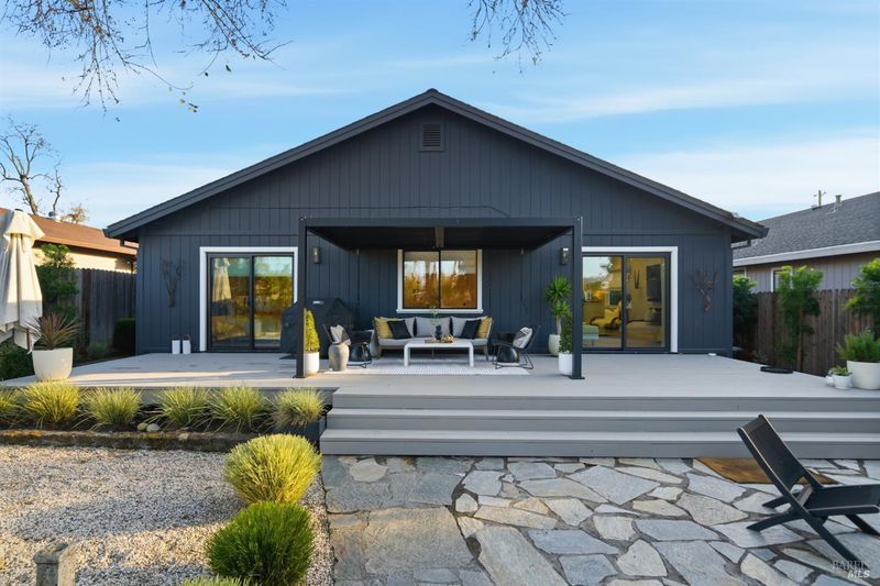 Welcome to an exquisitely renovated modern retreat just minutes from the Sonoma Plaza. This single level home blends elevated design with effortless indoor-outdoor living, offering a rare turnkey opportunity in one of Wine Country's most sought after neighborhoods. Step inside to soaring vaulted ceilings, abundant natural light, and a thoughtfully open floor plan ideal for both relaxation and entertaining. The spacious living area features contemporary lighting, custom stained wood flooring, and a beautifully finished fireplace that serves as an elegant focal point. The chef's kitchen is a true showpiece, complete with a large center island, quartz countertops, custom cabinetry, stainless-steel appliances, and generous counter seating. Flow seamlessly into the adjacent dining and secondary living spaces, each framed by large windows and sliding glass doors that highlight serene garden views. The primary suite offers a calming atmosphere with soft natural tones, plush carpet, and a stylish modern chandelier. Additional bedrooms are bright and versatile, perfect for guests, office use, or extended stays. Outside, the property transforms into a private sanctuary. A spacious deck with a sleek pergola, while expertly designed low-maintenance landscaping features mature trees, gravel pathways, lush plantings, and large turf lawn ideal for low maintenance enjoyment. Whether hosting gatherings or savoring quiet evenings under Wine Country skies, the backyard is a standout highlight. With refined updates throughout, exceptional outdoor living, and an unbeatable Sonoma location, 827 Verano Ave offers the perfect blend of comfort, style, and convenience. A true turnkey gem in the heart of Wine Country.