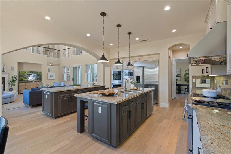 - Cooktop - Gas, Countertop - Granite, Dishwasher, Garbage Disposal, Hood Over Range, Island with Sink, Microwave, Oven - Double, Pantry, Refrigerator, Wine Refrigerator