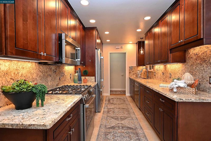 Open Sat & Sun 2p-4p. Wonderful single-story home offering upgrades throughout. The kitchen, fully remodeled in 2025, features soft-close drawers, cabinets and pantry doors including pull-out drawers, built-in full size trash & recycle cabinet, granite countertops, smart touch faucet and stainless sink with accessories. Appliances are Bosch top-of-the-line stainless steel. Ceiling and under-cabinet lighting are dimmable and outlets have USB ports. Flooring in kitchen and dining area is Italian porcelain tile. Original hardwood floors flow through most of the home, along with new carpet in 3 bedrooms; 3 bedrooms feature closet organizers. The remodeled den offers brand new, high-end carpet with floating built-in shelving. Enjoy year-round comfort with a top-of-the-line Lopi gas fireplace insert, a premier brand known for exceptional performance & quality. Step outside to a spacious, private backyard oasis featuring a freestanding pergola with a 3-speed reversible fan with light & string lights attached for ambiance. Additional highlights include seven mature, fruit-producing trees & patio furniture set with fire pit that will remain, as will all appliances. RV parking & full hookups, Ring doorbell and dual pane windows, so many amenities that make this home truly special!