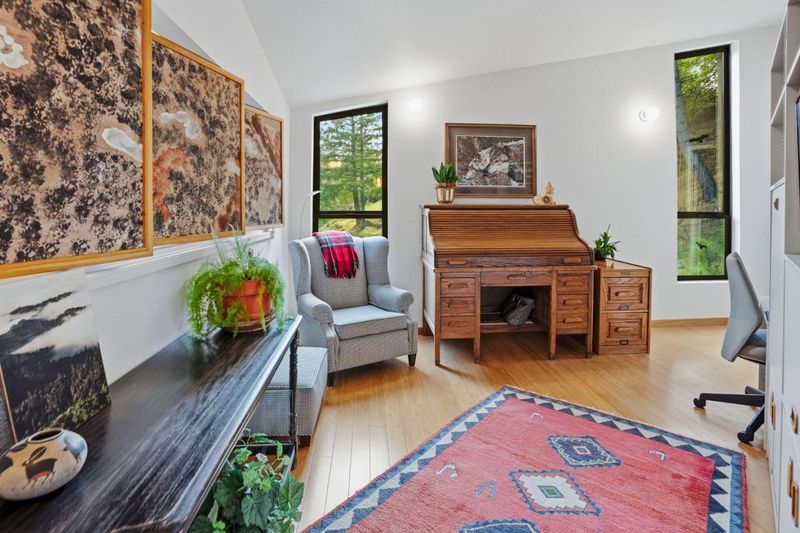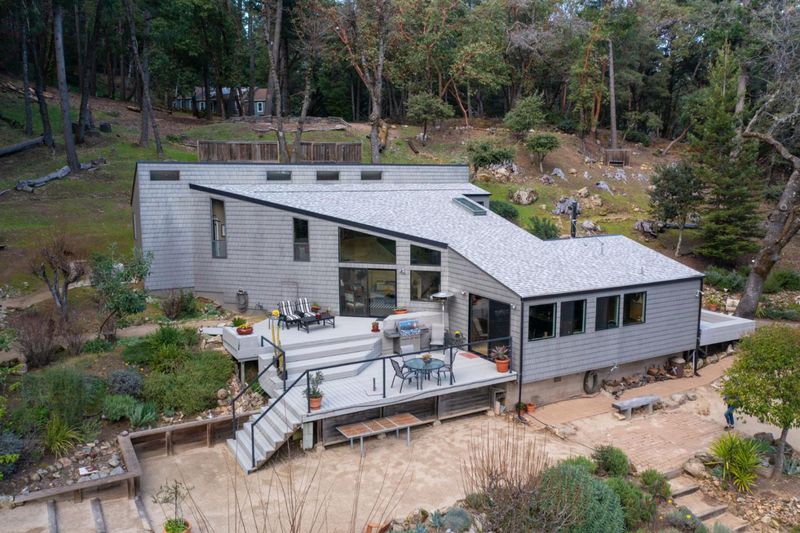 Nestled in the heart of Las Cumbres, this home draws inspiration from the iconic Sea Ranch modernist architecture of William Turnbull Jr., blending timeless design with the natural beauty of its surroundings. Soaring vaulted ceilings, clean modern lines, and open-concept layout define the homes striking interior, while expansive windows and seamless indoor-outdoor transitions foster a deep connection to the landscape. The primary suite opens onto a private patio and features a unique architectural opening overlooking the family room below, adding dimension and light. Two additional bedrooms each offer open loft spaces, ideal for creative use or quiet retreat. Thoughtfully curated decor and artistic elements bring warmth and character to every corner, balancing a modern aesthetic with an inviting, lived-in feel. Designed for effortless flow, the public living spaces extend gracefully into the outdoors. The beautifully landscaped exterior is a private sanctuary with mature trees, lush garden beds, and abundant sunshine. Whether entertaining guests or enjoying peaceful solitude, you'll find comfort in the, barbecue area, and cozy seating nook all crafted with care for both function and beauty. Features a detached two-car garage with additional storage and whole house generator.