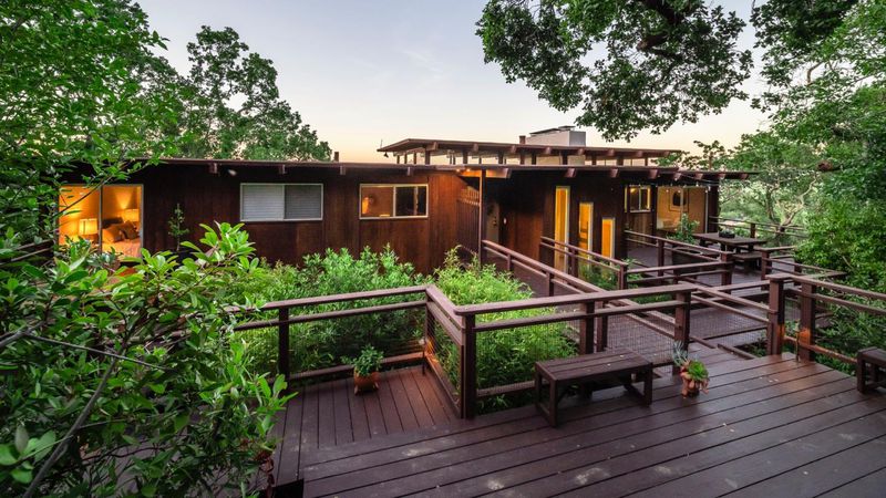 Mid-Century Modern enthusiasts will delight in this one of a kind architectural gem. Designed by architect Alan Blair, this home boasts three levels of blissful views reaching from San Francisco to Santa Clara. A host's dream! Tucked away from the flats, this stunning retreat is quiet and private. The home boasts three large decks, a hot tub, two gas fireplaces, an expansive remodeled lower level and two Tesla chargers in the garage, five bedrooms and three and a half bathrooms, an office upstairs and two living areas. The dining room contains Herman Miller light fixtures and high ceilings meet walls of expansive glass to thrill and entertain guests. Come claim this magical home that some have said has the best views in the Silicon Valley and experience all that this great community of Ladera offers.