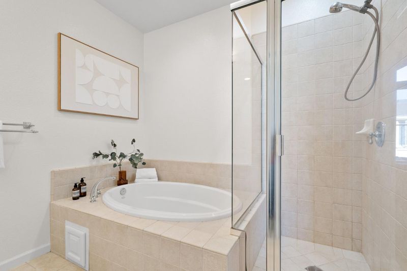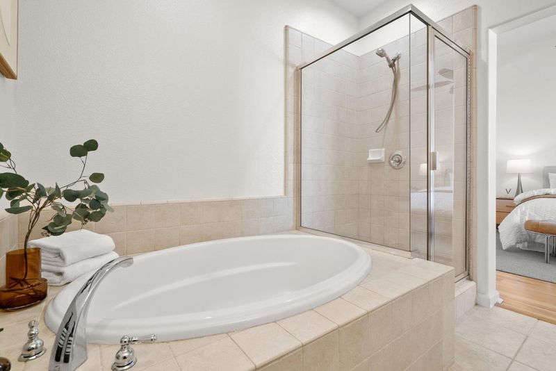 - Double Sinks, Granite, Primary - Oversized Tub, Shower and Tub, Shower over Tub - 1, Tile, Tub, Updated Bath