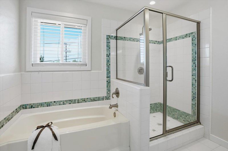 Double Sinks, Half on Ground Floor, Primary - Oversized Tub, Primary - Stall Shower(s), Shower over Tub - 1, Tile, Updated Bath